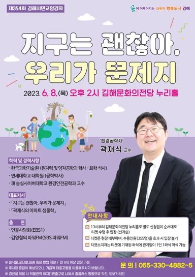 [제주교통복지신문 김강석 기자] 김해시는 오는 8일 오후 2시 김해문화의전당 누리홀에서 환경공학자 곽재식 교수를 초청해 ‘제354회 시민교양강좌’를 개최한다.