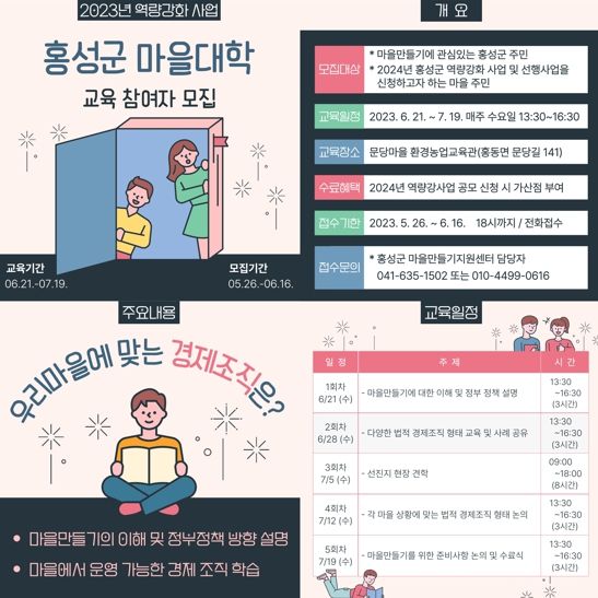 교육은 6월 21일부터 7월 19일까지 매주 수요일, 13시 30분~16시 30분에 진행되며 총 5회차 과정이다. 각 회차별 내용으로는 △마을만들기에 대한 이해 및 정부 정책 방향 설명, △다양한 법적 경제조직 형태 교육 및 사례 공유, △선진지 현장 견학, △각 마을 상황에 맞는 법적 경제조직 형태 논의, △주민주도의 마을만들기를 위해 준비해야 하는 사항으로 홍성군 마을에 맞는 특화된 프로그램으로 진행된다.