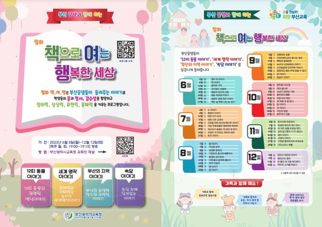 [제주교통복지신문 김강석 기자] 부산광역시교육청은 6월 5일부터 12월 12일까지 초등학교 1~4학년과 유치원생, 가족 등을 대상으로 ‘부산꿈샘과 함께 하는 월화 책·여·행(책으로 여는 행복한 세상)’ 프로그램을 운영한다고 1일 밝혔다.
