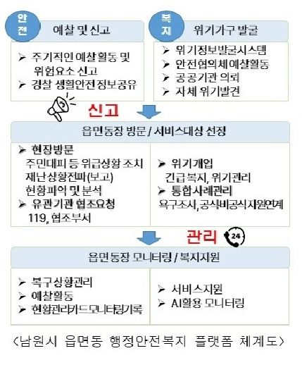 남원시는 “읍면동 행정안전복지 플랫폼 구축 시범사업”을 추진하여 읍면동 복지안전협의체 구성, 행정안전복지센터 전환 등 관련 선도사업을 적극 시행할 계획이다.