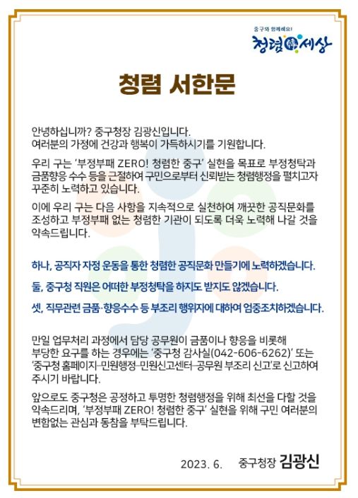 [제주교통복지신문 김강석 기자] 대전 중구는 6월 1일부터 10일까지 중구청 누리집을 통해 중구청의 반부패ㆍ청렴실천 의지를 담은‘구청장 청렴 서한문’을 게시한다고 밝혔다.