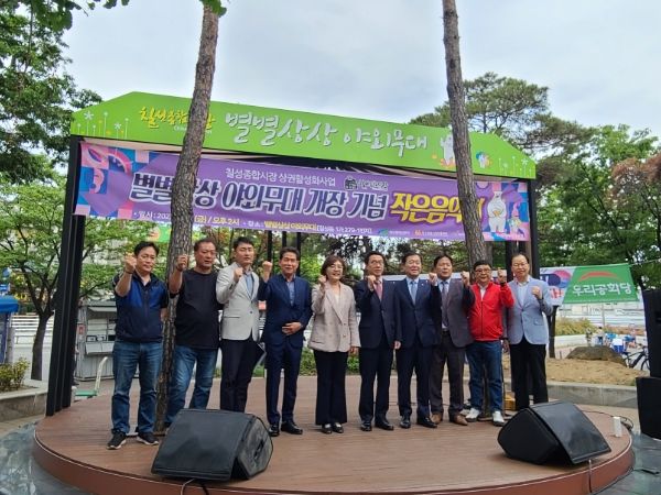 특히 이번에 조성한 야외무대는 넓이 30㎡ 높이 3.2m로 칠성종합시장 남편에 있는 칠성마당(대구 북구 칠성동1가 279-1 소재)에 위치하고 있으며, 문화와 예술을 사랑하는 사람들이 마음껏 끼를 발산하고 상인과 고객들에게 문화예술을 향유할 수 있도록 한다는 의미를 담아 ‘별별상상 야외무대’라는 명칭으로 지난 5월 26일 음악회와 함께 개장했다.