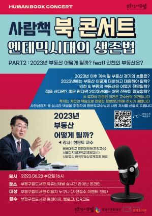 [제주교통복지신문 김강석 기자] 부평구 부개도서관이 오는 28일 미디어 창작공간 ‘나래’에서 온라인 사람책 북 콘서트 ‘2023 부동산 어떻게 될까’ 특강을 진행한다.