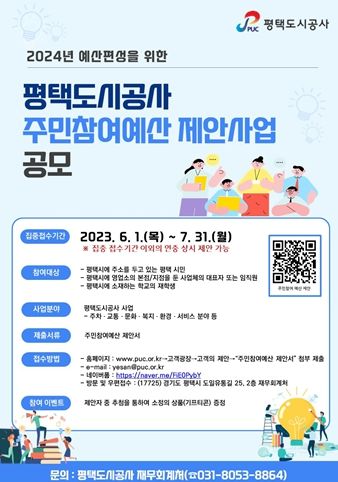 [제주교통복지신문 김강석 기자] 평택도시공사가 2024년 예산편성을 위한 ‘2023년 주민참여예산제’ 공모 접수를 7월 31까지 집중실시 한다고 밝혔다.