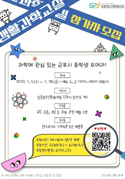 [제주교통복지신문 김강석 기자] (재)군포시청소년재단 당동청소년문화의집(관장 이혜진)은 오는 6월 13일까지 ‘2023년 당동청소년문화의집 생활과학교실’ 프로그램 참여자를 온라인을 통해 접수한다고 밝혔다.