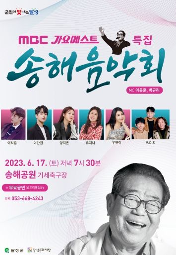 한편, 이번 음악회는 MBC 가요베스트 특집 '송해음악회'로 故송해 선생과 특별한 인연을 가진 가수들로 구성되어 의미를 더한다. 초청 가수로는 故송해 선생이 자랑스러워한 가수 이찬원과 감성적인 목소리를 가진 가수 이석훈을 비롯해 감미로운 하모니로 유명 히트곡을 보유한 그룹 VOS, 매력적인 음색을 가진 트롯가수 양지은의 무대가 준비되어 있다. 또한 故송해 선생과 전국노래자랑 무대를 함께 꾸며온 초청 가수 우연이와 수양딸로 알려진 유지나의 공연으로 다채롭고 풍성하게 선보인다. 방송 프로그램은 7월 중 MBC 가요베스트 특집 '송해음악회' 방송을 통해 소개 할 예정이다.
