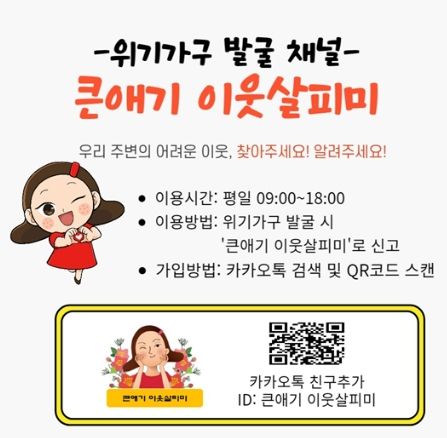 제보는 카카오톡 상단의 돋보기 모양을 누른 뒤 ‘큰애기 이웃살피미’를 검색해 채널을 친구 추가하고, 1:1 채팅 상담을 통해 위기가구의 인적 사항과 위기 상황 등을 입력하면 된다.