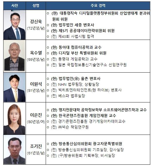 이번에 위촉된 위원은 총 5명으로, ▴ 강신욱 대통령직속 디지털플랫폼정부위원회 산업생태계 분과위원회 위원(법무법인 세종 변호사), ▴ 옥수열 동아대학교 컴퓨터공학과 교수, ▴ 이원석 법무법인 율촌 변호사, ▴ 이은진 명지전문대학 소프트웨어콘텐츠학과 교수(한국콘텐츠진흥원 게임인재원 교수), ▴ 조기진 방송통신심의위원회 광고자문특별위원이다.(가나다순)