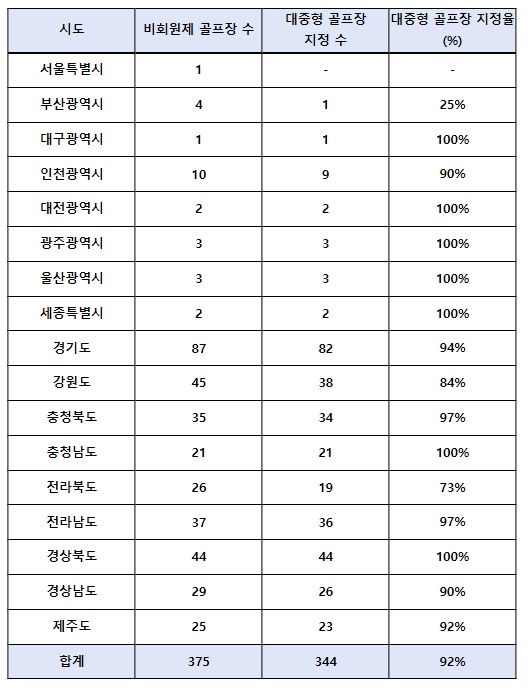 지역별로는 서울, 부산, 인천, 경기, 강원, 충북, 전북, 전남, 경남, 제주를 제외한 모든 광역자치단체의 비회원제 골프장이 대중형 골프장으로 지정됐으며, 대중형 골프장에 대한 정부의 낮은 세율 적용 효과가 골프장 이용자들에게 돌아갈 수 있을 것으로 기대된다.