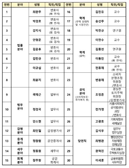 * (민간위원 25인) 전직 판・검사 등 법률전문가 8인, 법무사・감정평가사・공인중개사・세무사・ 공인회계사 등 주택 임대차 분야 전문가 7인, 주택 임대차 등 학계전문가 7인, 소비자보호 등 공익활동 경험자 3인 / (당연직 5인) 기재부, 법무부, 행안부, 국토부, 금융위 실장급