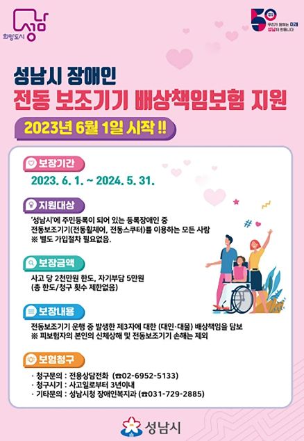 [제주교통복지신문 김강석 기자] 성남시는 장애인이 전동휠체어나 전동스쿠터를 운행하다 교통사고를 내면 최대 2000만원 배상금을 보장해 주는 보험에 가입했다고 2일 밝혔다.