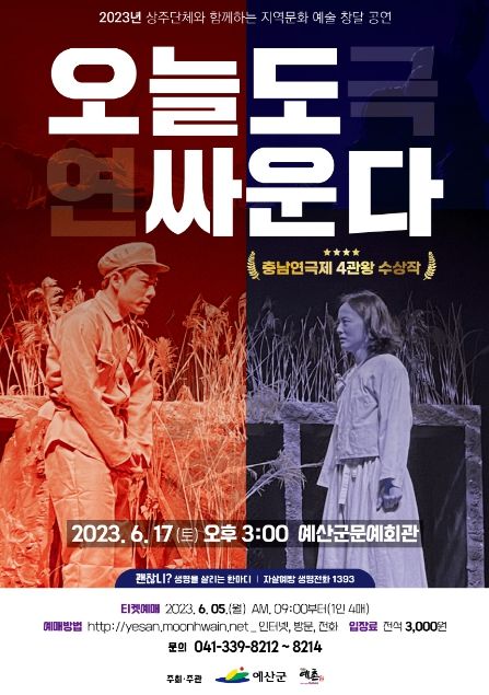 [제주교통복지신문 김강석 기자] 예산군 문예회관에서는 상주단체이자 전문예술단체인 극단 ‘예촌’과 협업을 통해 제작한 연극 ‘오늘도 싸운다’를 오는 6월 17일 오후 3시 문예회관 공연장에서 선보인다.