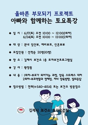 아빠와 함께하는 토요특강은 김제시 보건소 1층 모자보건 프로그램실에서 진행되며 접수 방법은 전화 또는 김제시 보건소로 방문 신청하면 된다.
