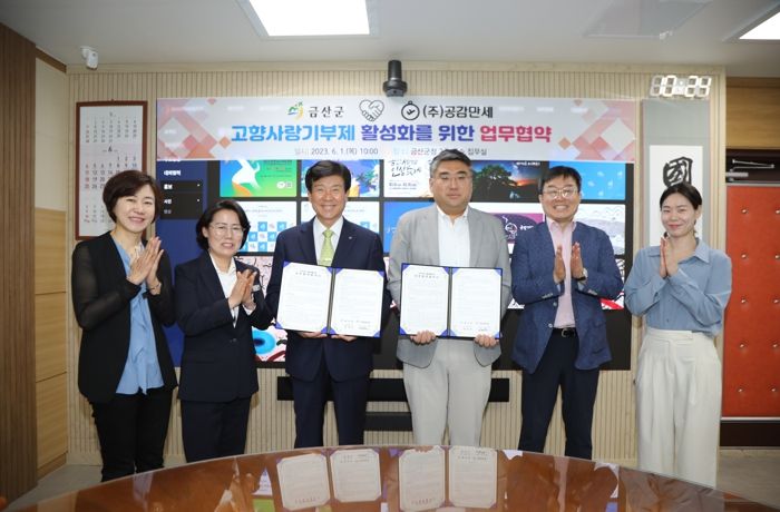 [제주교통복지신문 김강석 기자] 금산군은 지난 6월 1일 고향사랑기부제 홍보 활성화를 위해 사회적기업 ㈜공감만세와 상호협력 업무 협약을 체결했다.