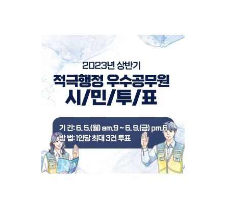 이번 온라인 시민투표에서는 7개 부서에서 제출된 총 7건의 적극행정 우수사례에 대해 시민들이 평가를 실시한다. 이후 실무위원으로 구성된 실무심사단의 평가점수를 합산해 최종적으로 인사위원회 심의를 통과한 2명이 상반기 적극행정 우수공무원으로 선발된다.