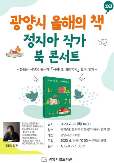 [제주교통복지신문 김강석 기자] 광양시립도서관이 오는 22일 오후 2시, 2023 올해의 책 성인 도서로 선정된 '아버지의 해방일지' 정지아 작가를 초청해 북 콘서트를 운영한다고 밝혔다.