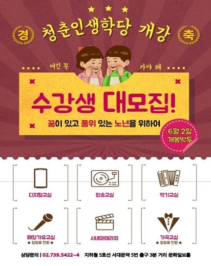 어르신 맞춤형 배움 프로그램인 '청춘 인생학당'은 시니어들의 관심사와 필요를 반영해 ▴디지털강좌 ▴악기·노래 ▴건강 ▴여가 등 총 6개 과목의 강좌를 마련했다. 강좌는 2개반(청춘반·인생반)으로 나누어 대면 프로그램으로 운영한다.