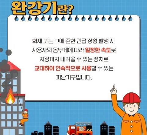 소방서 관계자는 “평소 완강기 위치와 사용법을 몰라 대피하지 못하거나 잘못된 사용 방법으로 인한 사고를 사전예방하기 위해 지속적으로 홍보활동을 전개하겠다.”고 전했다.