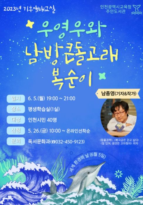 [제주교통복지신문 김강석 기자] 인천광역시교육청주안도서관은 세계 환경의 날을 맞아 도서관 특색사업인 기후생태교실의 일환으로 ‘우영우와 남방큰돌고래 복순이’ 강연을 5일 운영한다.