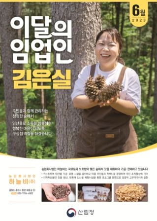[제주교통복지신문 김강석 기자] 산림청은 2023년 6월 ‘이달의 임업인’으로 강원 춘천에서 지역 특산물인 잣을 활용하여 가공·판매하는 김은실(만49세, 농업회사법인 하늘비)씨를 선정했다. 김은실 대표는 17년 전 귀산촌한 이후 임산물생산·가공·유통을 통해 고소득을 올리는 성공한 여성임업인이다.