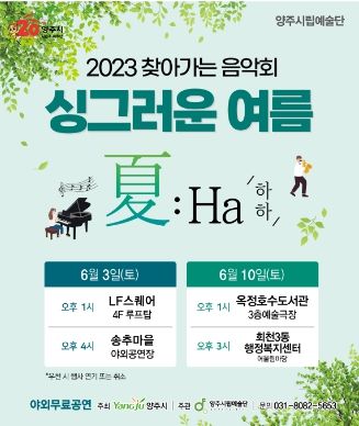 [제주교통복지신문 김강석 기자] 양주시는 오는 3일부터 6월 10일까지 양주시 일대에서 양주시립예술단의 찾아가는 음악회 ‘싱그러운 여름, 夏:HA(하하)’를 개최한다.