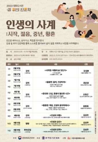 [제주교통복지신문 김강석 기자] 고양특례시 대화도서관이 6월 20일부터 8월 29일까지 인문학 강연 '인생의 사계'를 운영한다. '인생의 사계'는 인생을 ‘시작, 젊음, 중년, 황혼’으로 나누어 삶을 고찰하는 프로그램이다.