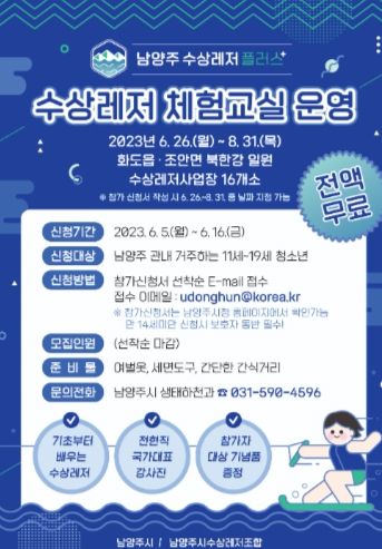 한편, 시는 어린이와 청소년들이 수상레저를 쉽고 재미있게 체험할 수 있도록 ‘북한강 수상레저 플러스(+)’사업을 추진하고 있으며, 이번 프로그램과 관련된 자세한 내용은 남양주시 블로그 또는 남양주시청 홈페이지 내 모집공고/일자리에서 확인할 수 있다.