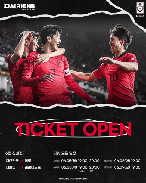 [제주교통복지신문 김강석 기자] 대한축구협회는 페루와 엘살바도르를 상대로 치르는 '하나은행 초청 축구국가대표팀 친선경기' 입장권을 5일부터 차례로 판매한다고 밝혔다. 클린스만 감독이 이끄는 축구대표팀은 오는 16일 부산아시아드주경기장에서 페루와, 20일 대전월드컵경기장에서 엘살바도르와 맞붙는다. 두 경기 모두 저녁 8시에 킥오프된다.