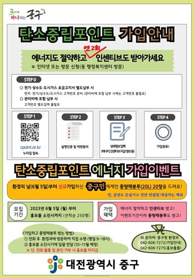 한편, 탄소중립포인트(에너지)는 전기, 상수도, 도시가스의 사용량을 절감하고 감축률에 따라 탄소포인트를 부여하는 전(全) 국민 온실가스 감축 실천제도로, 연 2회 인센티브를 지급하고 있다. 중구는 2022년도 하반기에 에너지 5% 이상 절약한 5,000여 가구를 대상으로 8,000여만 원을 6월 중 지급할 예정이다.
