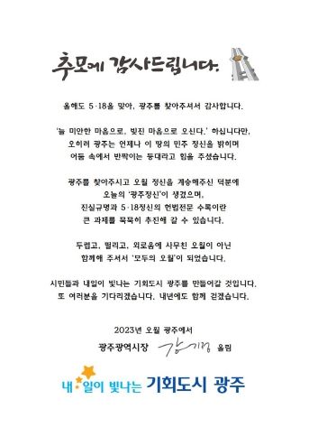 강 시장은 2일 전국 각지에서 오월광주를 찾은 학생·개인·단체 등 5·18민주묘지 참배객과 전일빌딩245 방문객, 기념행사를 연 전국시도5·18행사위원회 등에 감사 서한을 보냈다.