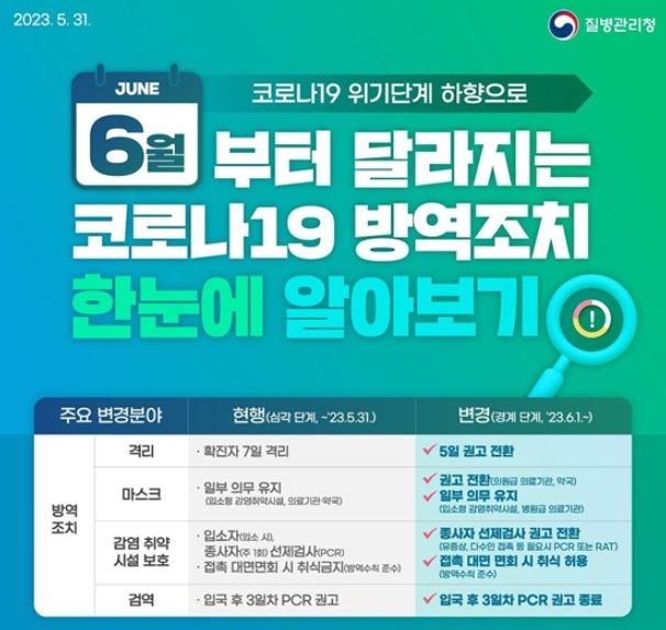 [제주교통복지신문 김강석 기자] 6월 1일(목)부터 코로나19 위기단계 하향됨에 따라 달라지는 방역조치에 대해 알려드립니다.