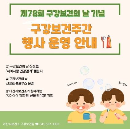 [제주교통복지신문 김강석 기자] 아산시가 제78회 구강보건의 날을 맞아 6월 9일부터 23일까지 구강보건 주간행사를 진행한다. 행사 기간에 거리 캠페인, 걷기 챌린지, 구강건강 QR 퀴즈 등 다양한 프로그램이 운영된다.
