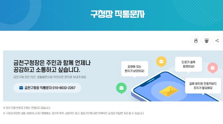 ‘구청장 직통문자’ 코너에는 금천구에 관한 의견, 생활불편 사항 등 무엇이든 문자로 물어볼 수 있는 문자 전용 핸드폰 번호를 안내하고 있다. 금천구는 주민들이 구청장 직통문자를 통해 최대한 성의 있고 구체적인 답변을 받을 수 있도록 운영하고 있다.