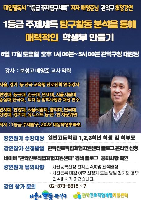 이에 구는 오는 6월 17일 오후 1시 관악구청 대강당에서 공교육 입시전문가인 보성고등학교 배영준 강사를 초빙해 ‘1등급 주제세특(’세부능력‘과 ’특기사항‘) 탐구활동 분석을 통해 매력적인 학생부 만들기’를 주제로 ▲과목별 주제탐구 방법 ▲변화된 학생부 평가요소를 고려한 대입 수시 전략 등에 대한 강연을 개최한다.