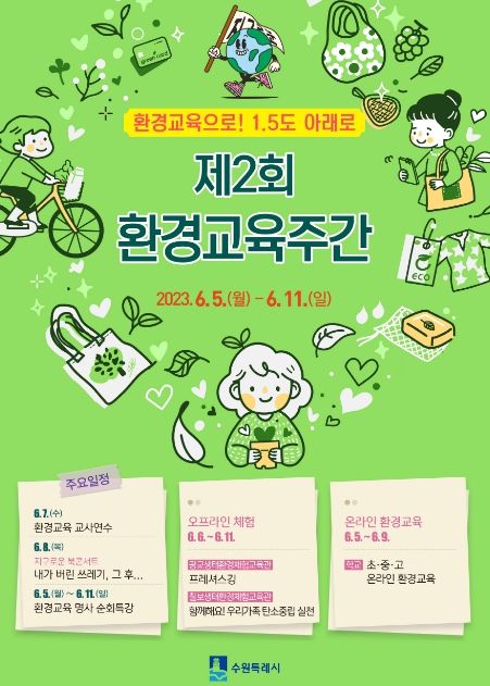 [제주교통복지신문 김강석 기자] 수원시는 5일부터 11일까지 ‘환경교육으로! 1.5도 아래로’를 슬로건으로 하는 ‘제2회 환경교육주간’을 운영한다.