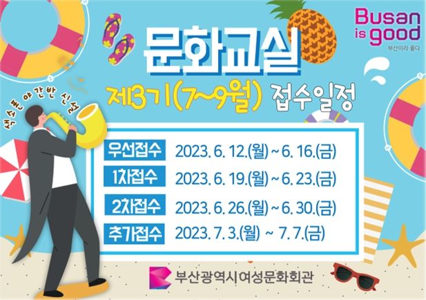 [제주교통복지신문 김강석 기자] 부산시 여성문화회관은 시민들에게 전문적인 능력개발 및 삶의 질 향상을 위한 폭넓은 기회를 제공하고자 2023년 제3기 문화교실 수강생을 모집한다고 밝혔다.