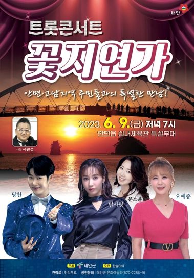군은 6월 9일 오후 7시 안면읍 실내체육관에서 트로트 가수들이 출연하는 ‘꽃지연가(戀歌)’ 공연이 열린다고 밝히고 지역 주민들의 많은 관심과 참여를 당부했다.
