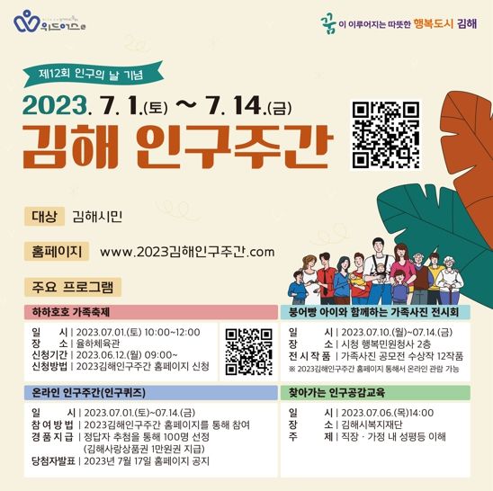 [제주교통복지신문 김강석 기자] 김해시는 제12회 인구의 날(7.11)을 기념해 7월 1일부터 14일까지 2주간 ‘2023 김해 인구주간’을 운영한다고 5일 밝혔다.