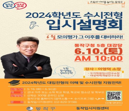 [제주교통복지신문 김강석 기자] 동작구가 ‘2024학년도 대입을 위한 수시전형 입시설명회’를 오는 10일 구청 대강당에서 개최한다고 밝혔다.