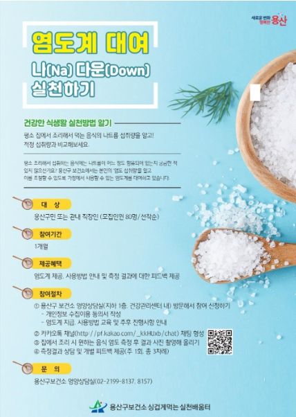 참여를 원하는 구민 또는 용산구 소재 직장 근무자는 구청 지하1층 건강관리센터 영양상담실에 방문해 개인정보 이용 동의서를 제출하면 된다. 상담실에서는 염도계, 사용방법 교육, 진행사항 안내를 받을 수 있다.