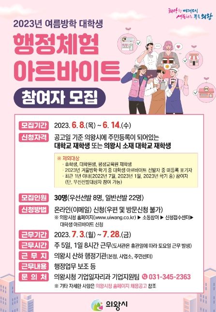 [제주교통복지신문 김강석 기자] 의왕시가 여름방학을 맞아 관내 대학생에게 시정 체험 및 등록금 마련의 기회를 제공하기 위해 ‘2023년 여름방학 대학생 행정체험 아르바이트’ 참여자를 모집한다고 밝혔다.