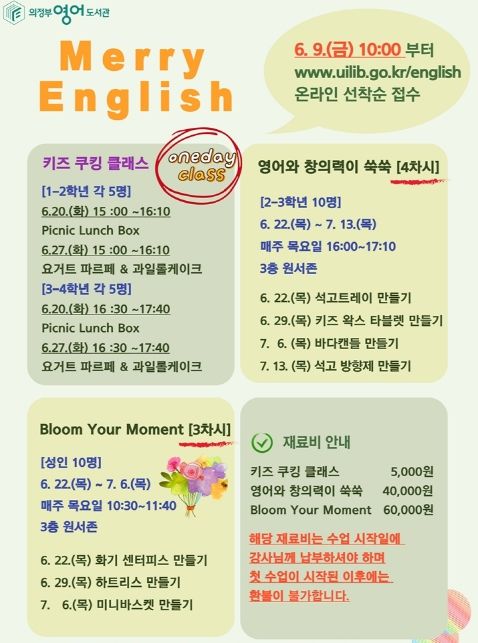 [제주교통복지신문 김강석 기자] 의정부시는 6월부터 의정부영어도서관에서 즐거운 영어 감정을 만들어 나가는 ‘Merry English’ 프로그램을 운영한다.
