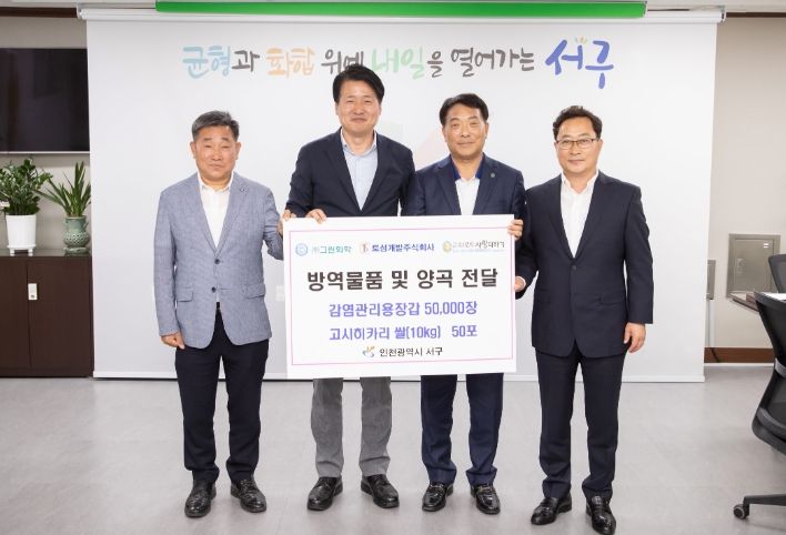 [제주교통복지신문 김강석 기자] 인천시 서구는 2일 ㈜그린화학와 토성개발주식회사가 이웃돕기 물품으로 감염병예방 장갑 5만 장과 쌀 10kg 50포를 전달했다고 밝혔다.