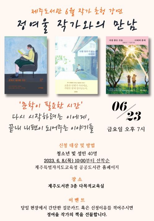 [제주교통복지신문 박희찬 기자] 제주도교육청 제주도서관은 6월 23일 오후 7시 제주도서관 3층 다목적교육실에서 정여울 작가의 저서『문학이 필요한 시간』을 주제로 작가와의 만남 행사를 진행 할 예정이다.
