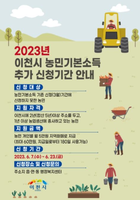 [제주교통복지신문 김강석 기자] 이천시는 2023년 기존 농민기본소득 신청 기간에 신청하지 못한 농민들을 위하여 6월 7일부터 23일까지 추가 신청·접수를 받는다고 밝혔다.