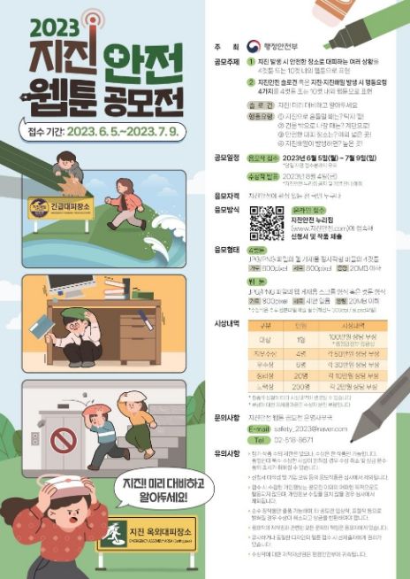 [제주교통복지신문 김강석 기자] 행정안전부는 6월 5일부터 7월 9일까지 '지진안전 웹툰 공모전'을 실시한다고 밝혔다.
