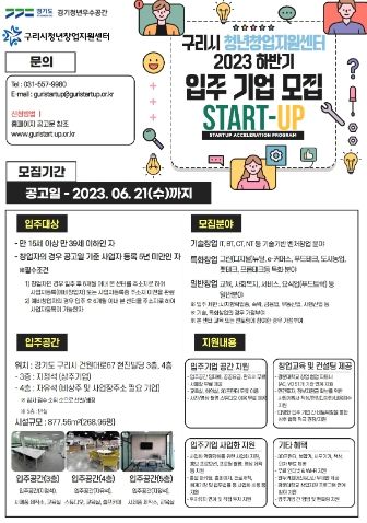 [제주교통복지신문 김강석 기자] 구리시는 6월 1일부터 6월 21까지 2023년 하반기 청년창업지원센터 신규 입주기업을 모집한다고 밝혔다.