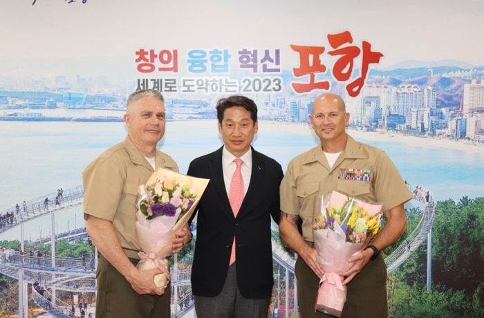 [제주교통복지신문 김강석 기자] 한미동맹 70주년을 맞아 포항시는 5일 시청에 방문한 주한미군 해병대 ‘캠프무적’ 이·취임 부대장에 감사를 전하고 상호협력 관계를 공고히 하기 위해 스포츠 관람권 120매를 전달했다고 밝혔다.