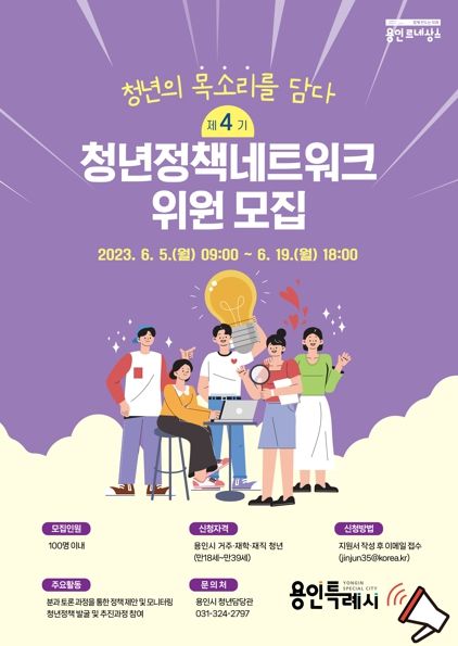 용인특례시 관계자는 “청년의 더 나은 삶을 위해 함께 고민하고 활동할 청년들의 관심과 참여를 부탁한다”며 “청년정책의 주인공인 청년들이 다양한 의견을 내고 자신의 생각을 정책으로 실현하는 기회를 가져보길 바란다”고 말했다.