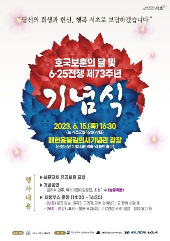 먼저 구는 오는 15일 오후 4시 30분 서초구에 거주하는 보훈대상자와 주민 400여 명을 초청해 ‘호국보훈의 달 및 6·25전쟁 제73주년 기념식’을 매헌윤봉길의사기념관에서 연다. 보훈대상자에게는 감사의 뜻을 전하고 주민들에게는 나라사랑 정신을 돌아보게 하는 자리로, 현대자동차(주) 및 ㈜기아 등의 후원으로 열린다.